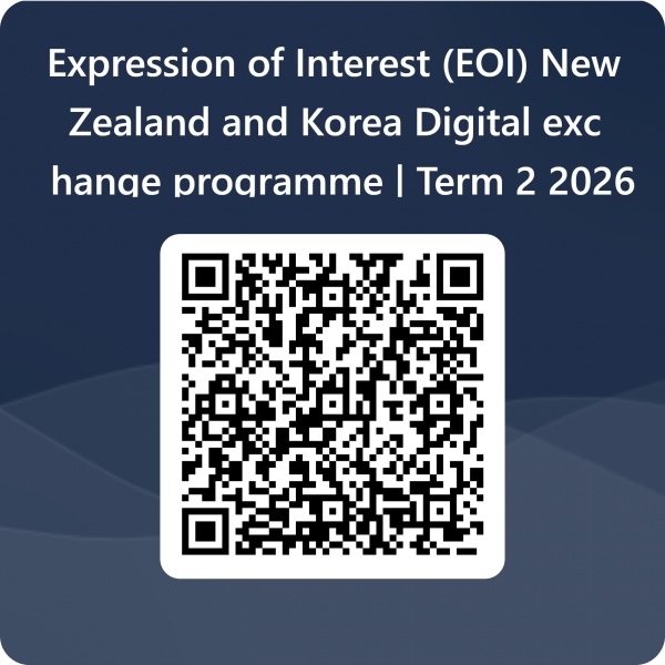 If you wish to apply for this programme, please fill out the Expression of Interest (EOI) here or scan the QRCode below. If you have any questions, please contact ENZ (Alana Pellow ) or Learn English Live (William Clarke ).   BackgroundENZ has partnered with the Seoul Metropolitan Office of Education (Seoul MOE) to run digital classroom exchanges since 2021 with ENZ education technology partner Learn English Live (LEL) . These exchanges have created meaningful connections between students, teachers, and schools in both countries. NZ students have had the opportunity to connect with their Korean peers, build global friendships, and experience cross-cultural learning—all from their own classrooms.
