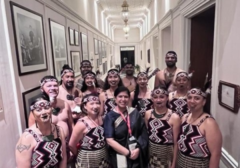 Monika (centre) with the kapa haka group that supported the Prime Minister’s trade mission to India in 2025
