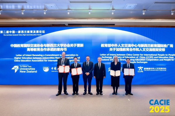 Minister for Universities and Minister of Science, Innovation and Technology, Hon Dr Shane Reti and REN Youqun, Vice Minister of Education of China witnessed the signing of Letter of Intent between Universities New Zealand and China Education Association for International Exchange (CEAIE) and Education New Zealand and China Centre for International People-to-People Exchange (CCIPE) at the 2nd New Zealand High-level Education Forum. The letters of intent between Chinese and New Zealand government agencies places existing collaboration within a more formal framework, allowing both sides to work more effectively together to advance shared education cooperation goals.