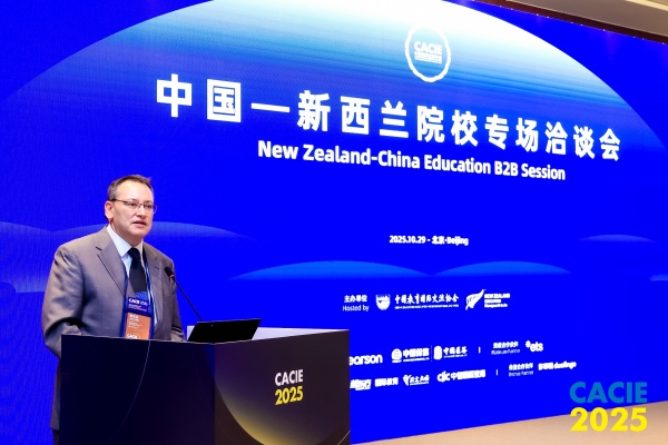 Minister for Universities and Minister of Science, Innovation and Technology, Hon Dr Shane Reti delivering welcome remarks at New Zealand-China Education B2B Session. As part of the China Annual Conference for International Education (CACIE), the B2B Session attracted over 117 visitors to engage in productive dialogues with participating New Zealand tertiary institutions aiming to build collegial partnership.